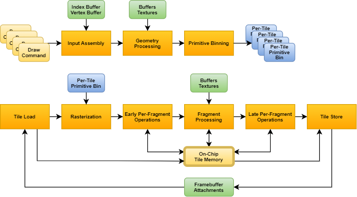 The most interesting and commonly used dependency flag remains the VK_DEPENDENCY_BY_REGION_BIT that exists since Vulkan 1.0. As discussed in detail in our popular article GPU architectures explained, unlike immediate-mode rendering (IMR) GPUs, tile-based rendering (TBR) GPUs do not implement the graphics pipeline in the traditional order it is typically described in. Instead, they first perform the so called “binning” phase that encompasses most of the geometry processing stages and then performs the fragment processing stages for each tile, one after another (of course, with appropriate parallelism as the number of shader cores in the GPU allows).