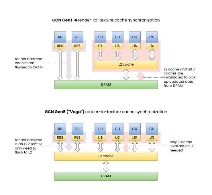 Behavior of render-to-texture cache[1] synchronization on GCN Gen1-4 (top) and Gen5 (bottom).