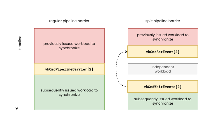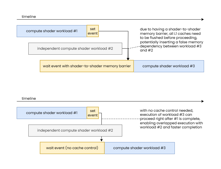One more interesting aspect of VK_KHR_synchronization2 is that the split version of pipeline barriers now includes the memory dependencies as part of the information passed to vkCmdSetEvent2. In order to understand why the original design did not include that information in the first part of the split barrier, it is worth looking into how they were implemented on the GCN architecture originally (and likely on many other GPU architectures). There, execution control was as simple as signaling the completion of earlier work by asking the hardware to write a value to a memory address (the VkEvent object) once the work is complete that the GPU’s command processor can then wait on later (as discussed earlier, the original GCN could only wait at the “top of the pipe”). The cache control operation itself (both cache flushing and invalidation) was a completely orthogonal operation issued by the command processor afterwards. Therefore, specifying the memory dependencies as part of the signal operation (vkCmdSetEvent) was unnecessary. However, on an implementation that can combine execution control and cache control operations or one that can issue cache flushes separately from cache invalidations, having the information up-front, at the time of signaling the event, enables issuing any necessary cache flushes earlier or otherwise optimizing the process. Therefore the new model isn’t just better from the perspective of the formal model, but can actually provide tangible benefits on a sufficiently sophisticated hardware implementation.