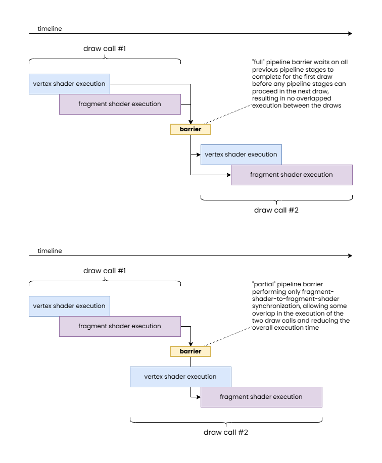 Comparison between a “full” pipeline barrier (top) and a “partial” pipeline barrier (bottom).