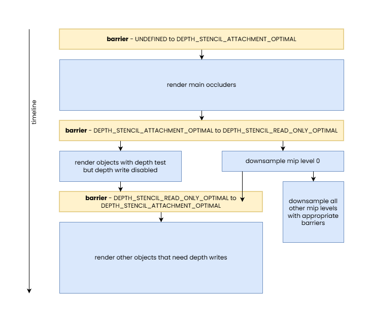 In this case we, once again, work with an image used as depth attachment, but one that has mip levels. The base level is generally used as a depth attachment, therefore its default image layout remains to be VK_IMAGE_LAYOUT_DEPTH_STENCIL_ATTACHMENT_OPTIMAL, but for all other mip levels that are normally used only in the occlusion culling passes as input will have a default image layout of VK_IMAGE_LAYOUT_SHADER_READ_ONLY_OPTIMAL.