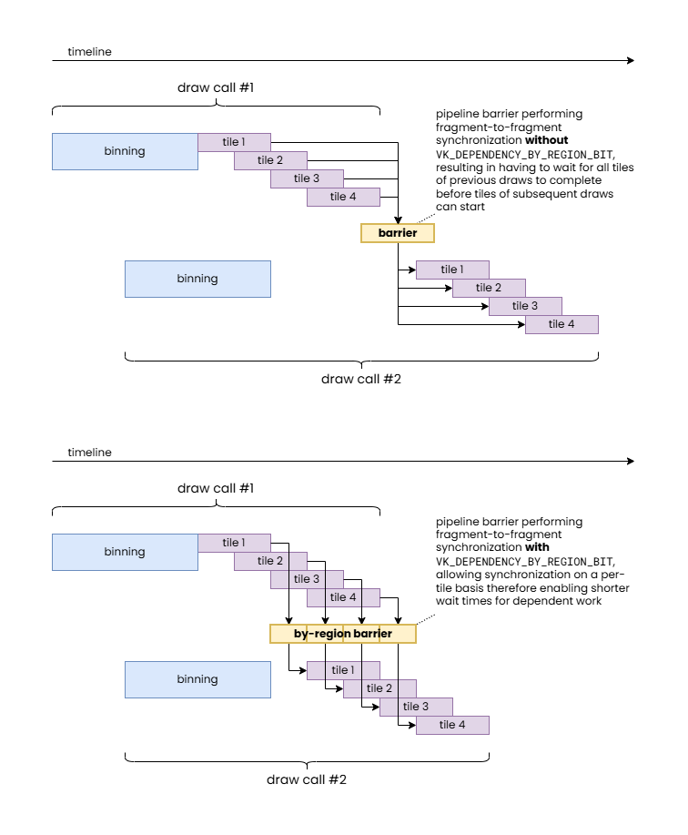 Comparison of the behavior of a fragment-to-fragment pipeline barrier on a tile-based rendering GPU without (top) and with (bottom) VK_DEPENDENCY_BY_REGION_BIT.