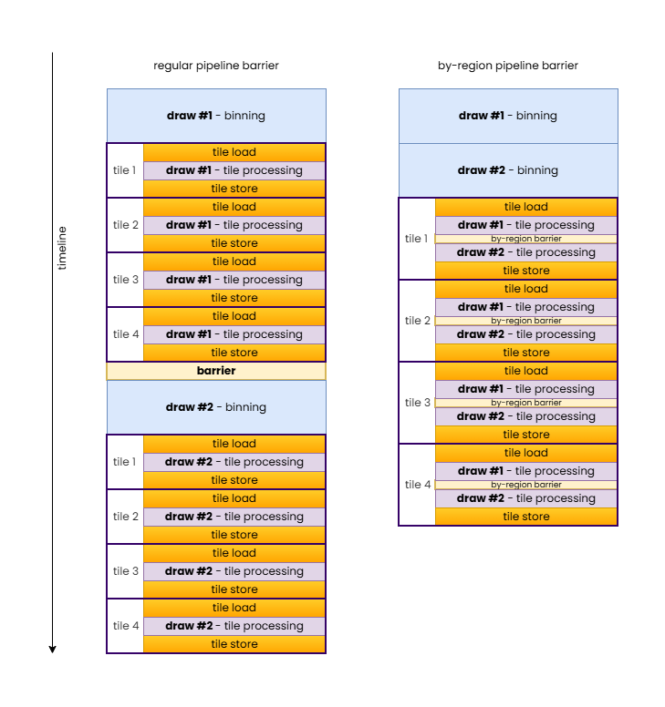 Comparison of the behavior of a fragment-to-fragment pipeline barrier on a single-core tile-based rendering GPU without (left) and with (right) VK_DEPENDENCY_BY_REGION_BIT.