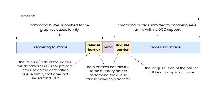 In this example, an image with DCC is handed off to a queue family that is not able to interpret DCC data, therefore the “release” side of the pipeline barrier pair performing the queue family ownership transfer is responsible to perform a DCC decompress.