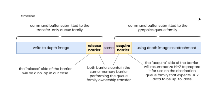 In this example, a depth image updated by a transfer-only queue is handed off to the graphics queue family that expects to use Hi-Z data, therefore the “acquire” side of the pipeline barrier pair performing the queue family ownership transfer is responsible to perform a Hi-Z resummarization.